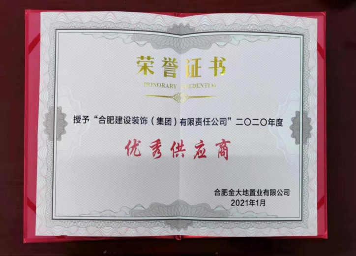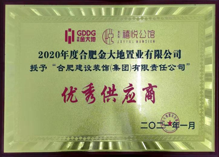 合肥金大地置业有限公司2020年度“优秀供应商”证书