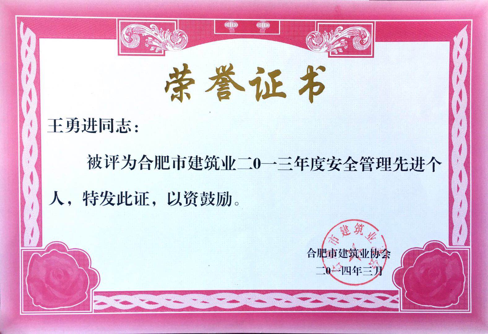 2013年度安全管理先进个人王勇进