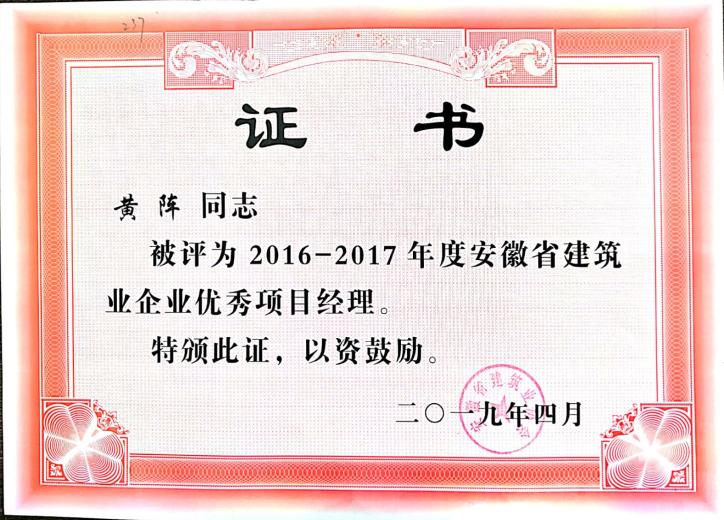 >2016-2017年安徽省建筑业优秀项目经理——黄阵