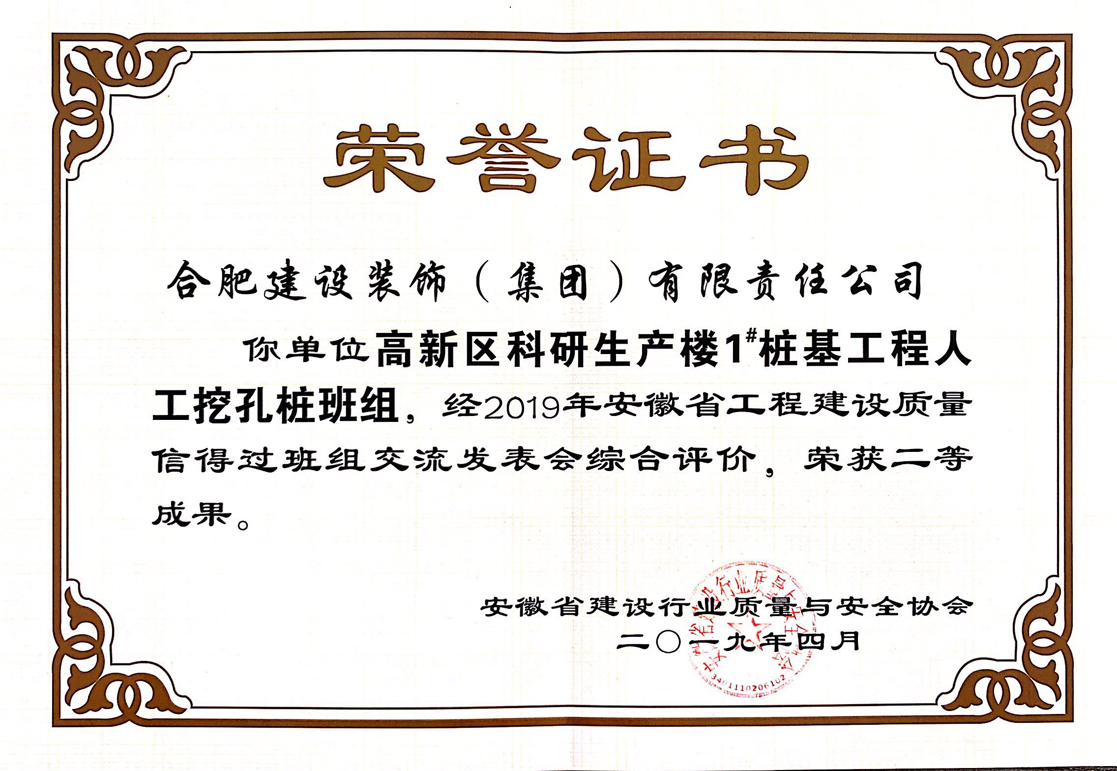 2019年安徽省工程建设质量信得过班组二等成果