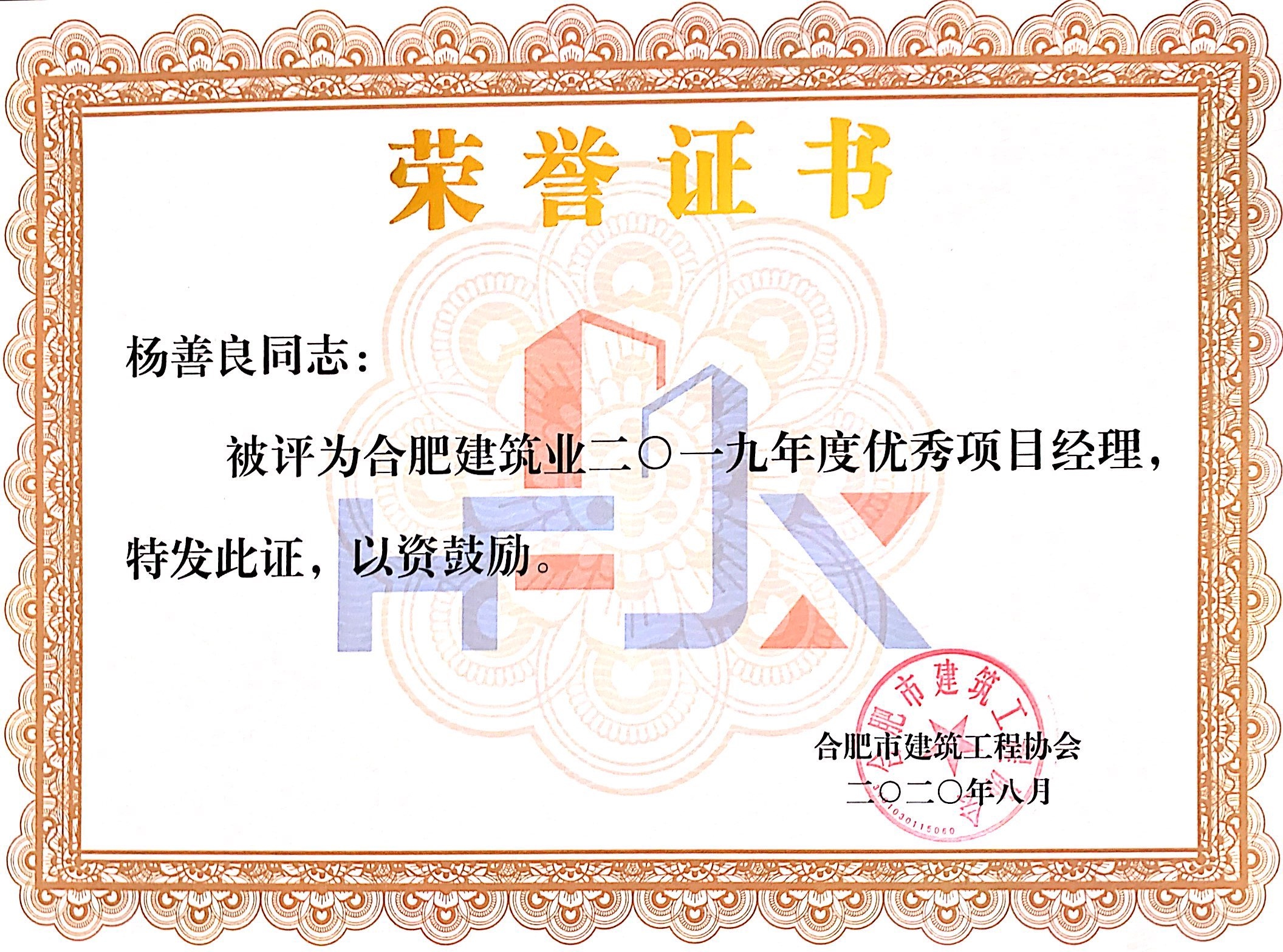 合肥市建筑业2019年度优秀项目经理——李宗成