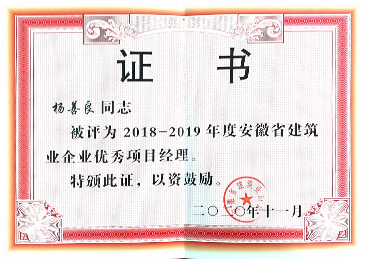 >2020年安徽省建筑业企业优秀项目经理--杨善良