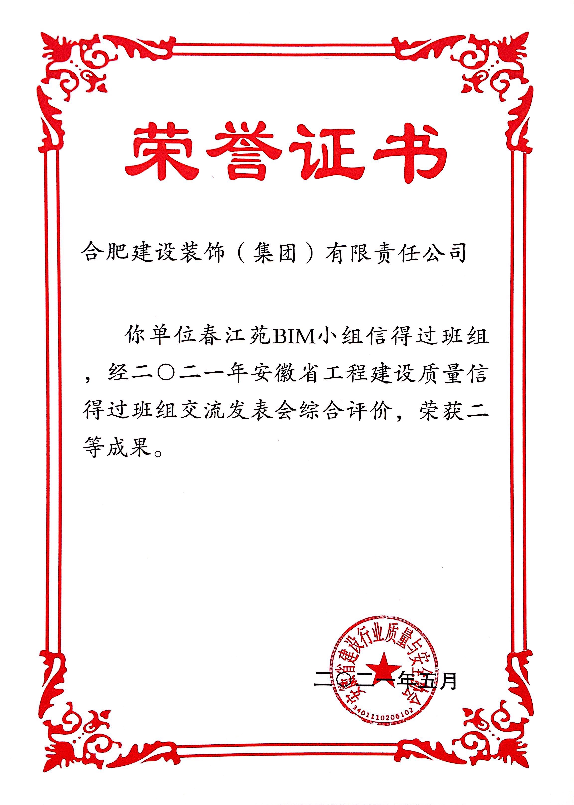>春江苑BIM小组信得过班组 2021年安徽省工程建设质量信得过班组交流会综合评价二等成果