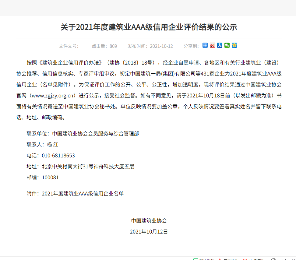 >关于2021年度建筑业AAA级信用企业评价结果的公示