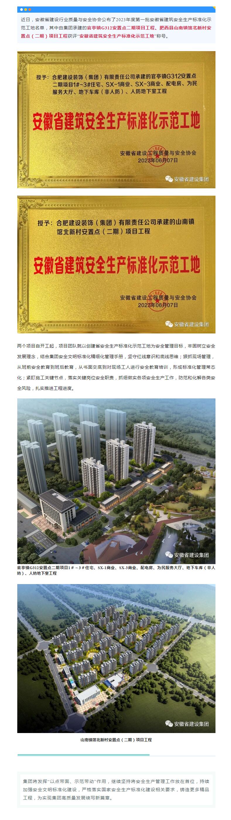 集团两项目荣获“安徽省建筑安全生产标准化示范工地”称号