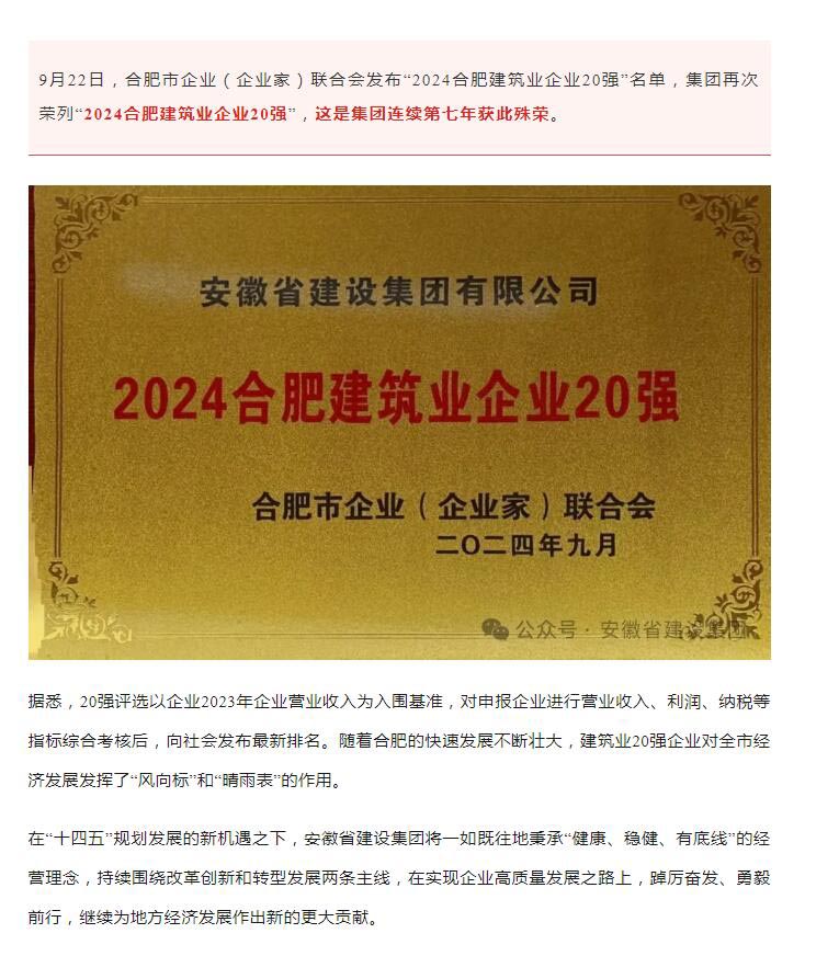 集团连续七年荣登“合肥建筑业企业20强”榜单